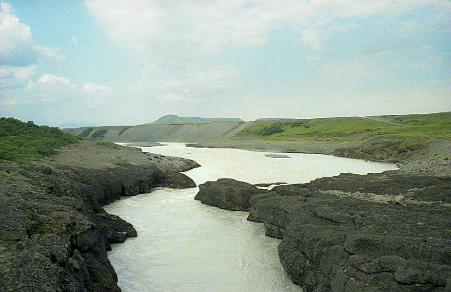 Ovanför fallen är floden Hvita tänligen lugn. |