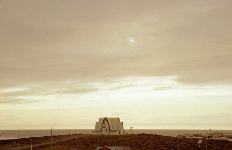 Kyrkan i Kópavogur, i ovanlig design med dubbla bågar över entrén. |