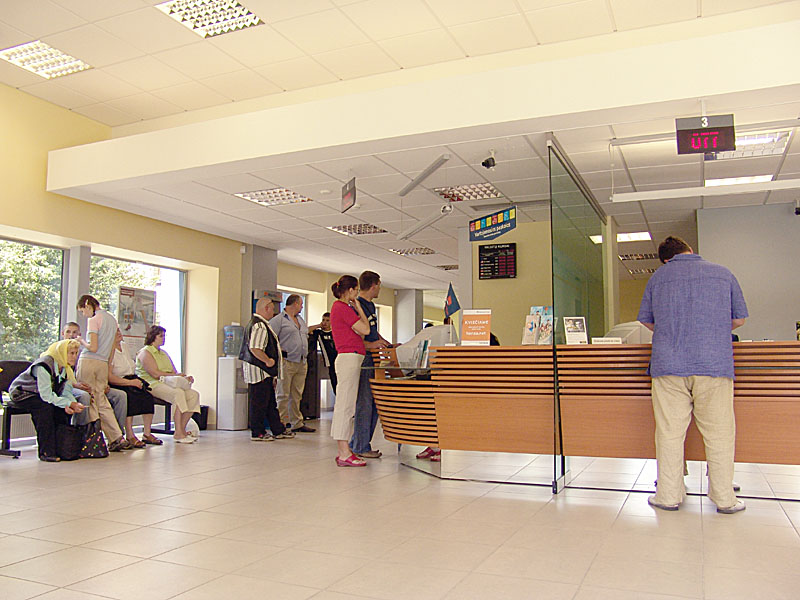 bankkontoren är fyllda med köande människor och bakom diskarna går elegant klädda flickor